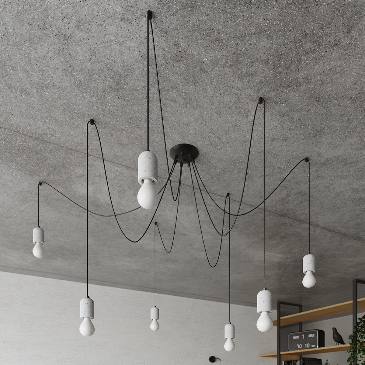 Única y versátil, NESO es una iluminación que te ayudará a crear un espacio en el que cada elemento hable de ti. En la colección encontrarás una amplia gama de modelos adaptados a diversas necesidades. Desde una lámpara colgante en forma clásica, hasta una versión larga con cable de 190 cm y una lámpara de pared, e incluso candelabros con 3, 6 u 8 puntos de luz. El cable largo puede ser un elemento decorativo interesante. Átalo en un nudo, haz un lazo o cuélgalo de una manera no convencional, agregando así un carácter único a tu interior. La colección NESO refleja las tendencias actuales en diseño, con un toque de rudeza industrial y libertad loft. Está hecha de concreto gris y PVC negro, lo que la hace duradera y llamativa. Se adapta fácilmente a diferentes arreglos de interiores: desde lofts rudos hasta espacios más refinados.